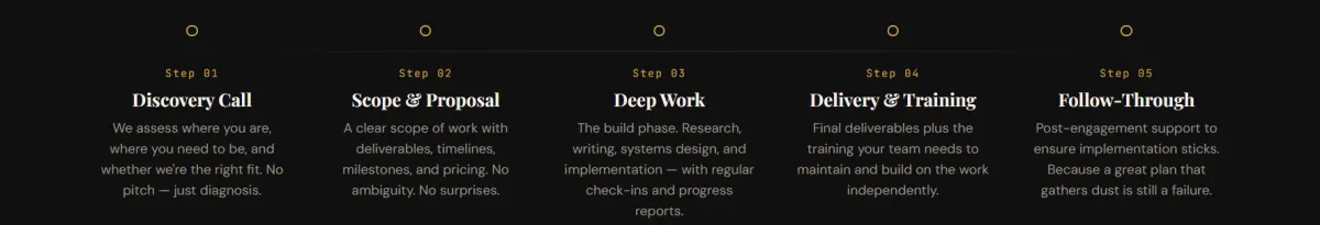 No filler. No frameworks that collect dust. Every service is designed to build operational infrastructure your organization can run long after we're done working together.